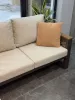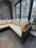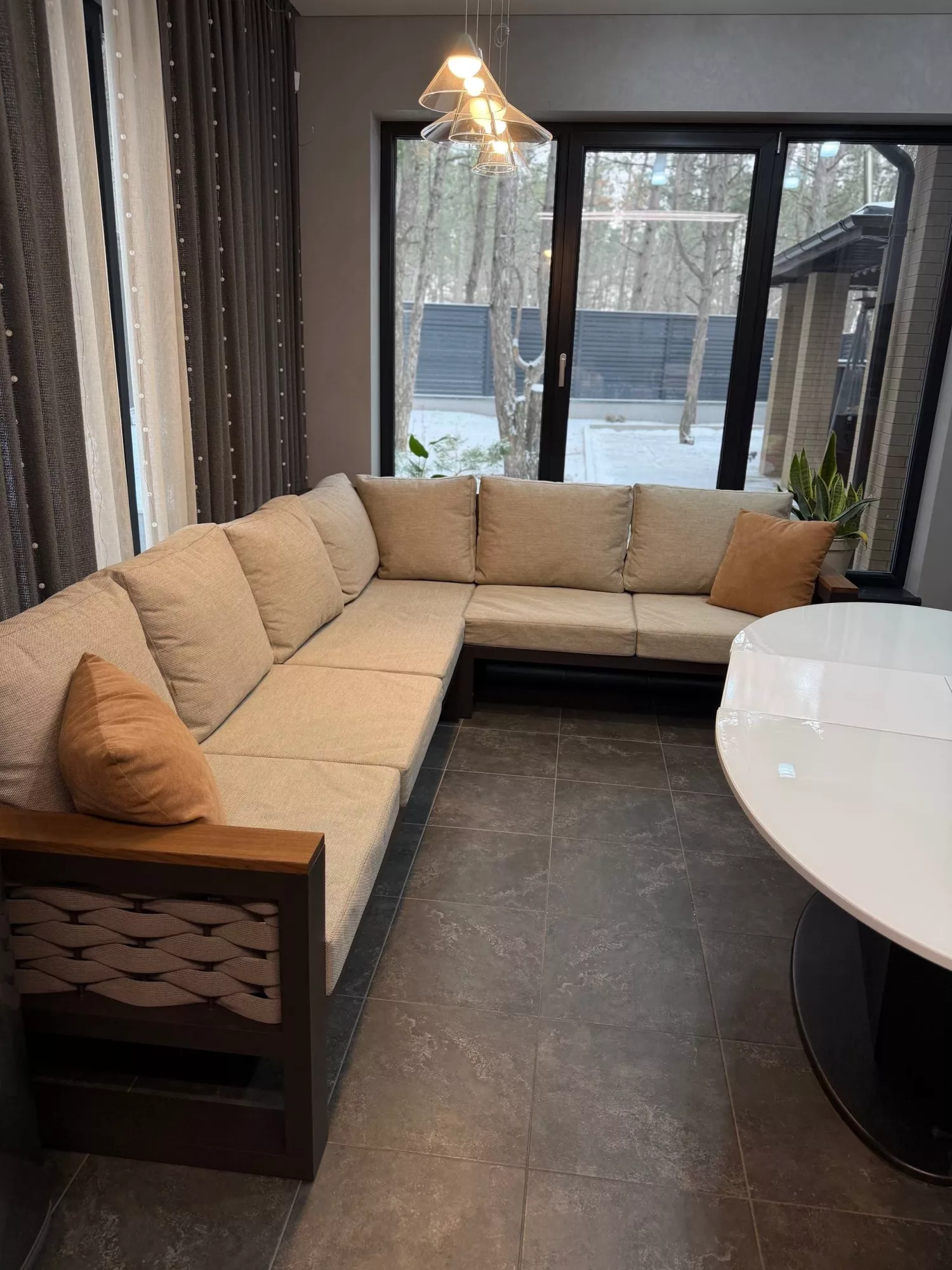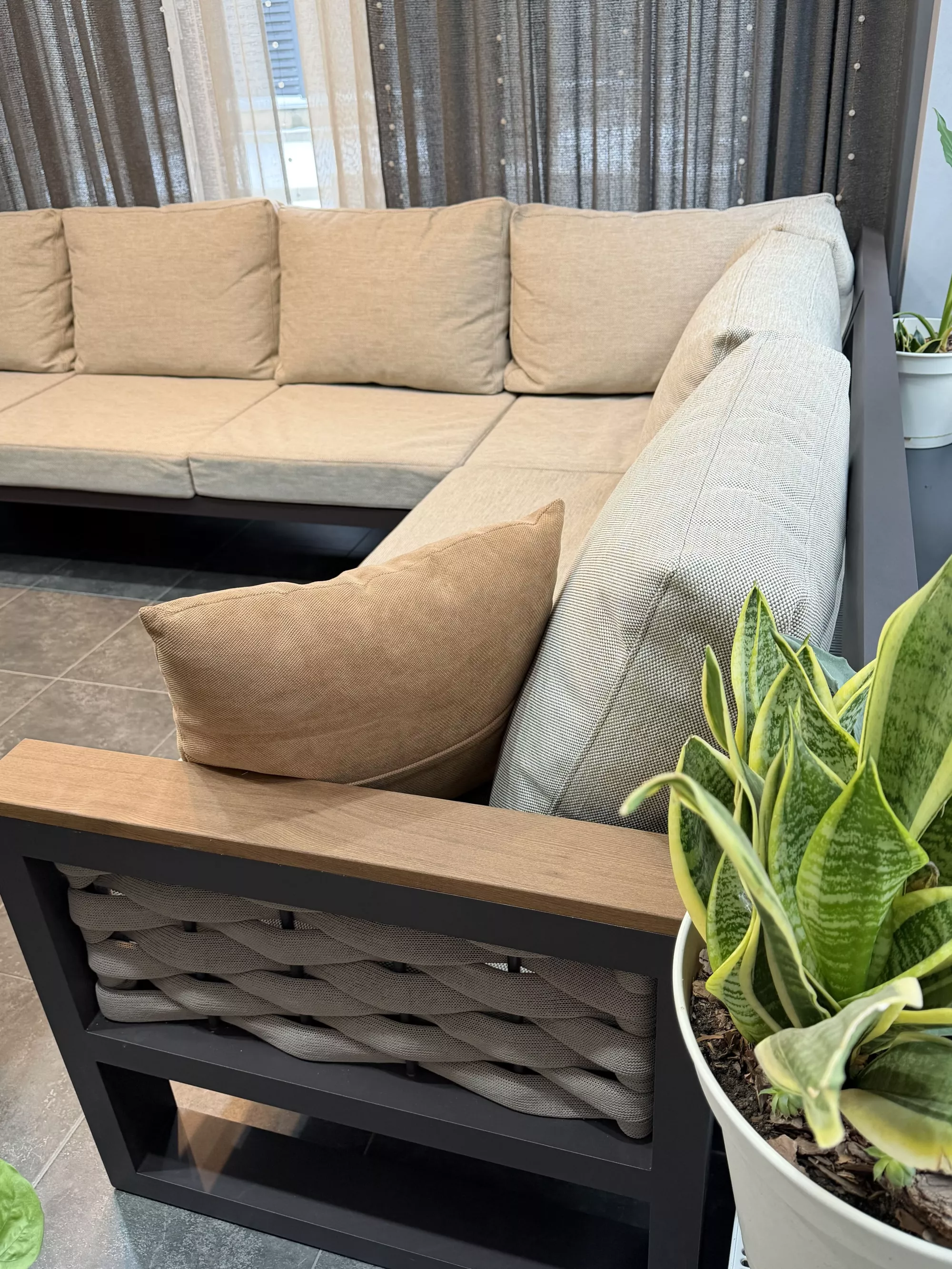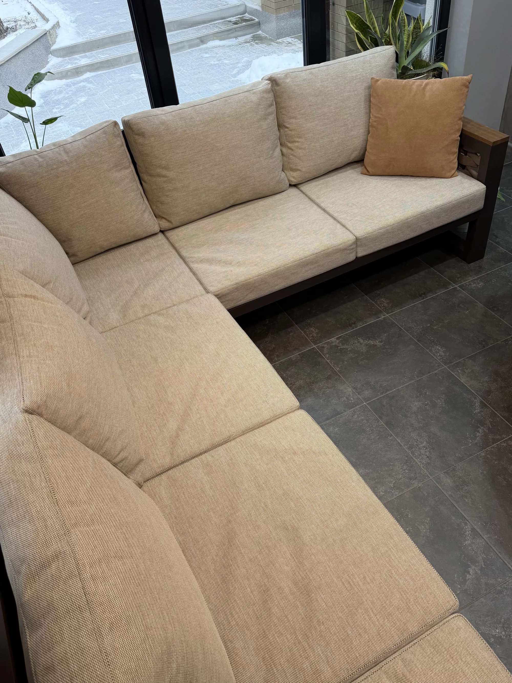 Стиль и атмосфера: Угловой диван в нейтральной палитре бежевых и земляных оттенков гармонично вписывается в интерьер с большими панорамными окнами, открывая вид на зимний сад. Тепло дерева, контраст черного каркаса и мягкая текстура ткани создают ощущение уюта и респектабельности. Дополнительные декоративные подушки и живые растения усиливают ощущение домашнего комфорта и связи с природой.